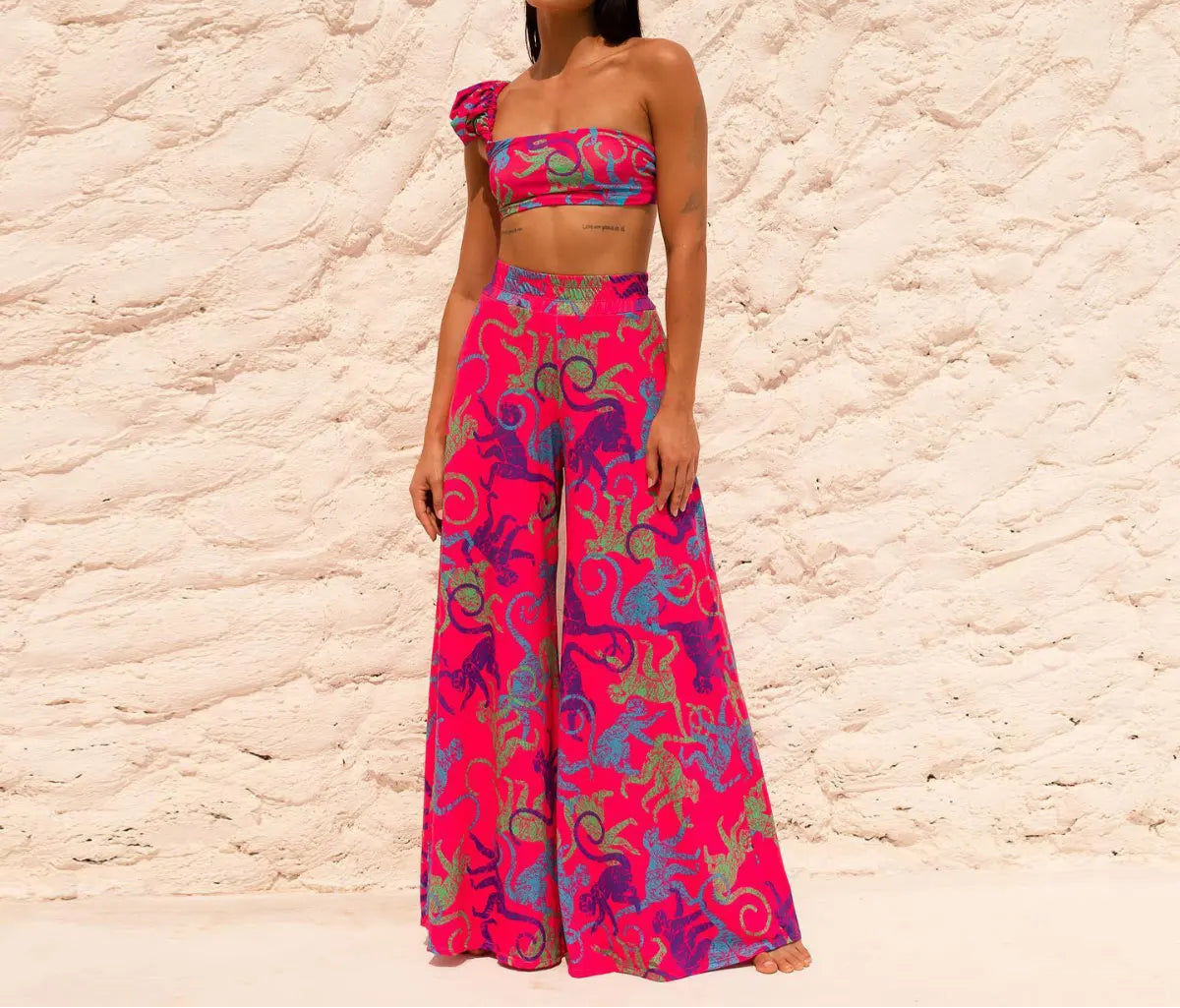 Style: Bandage wrap top with knot detail, high-leg bikini bottom, wide-leg sheer pants