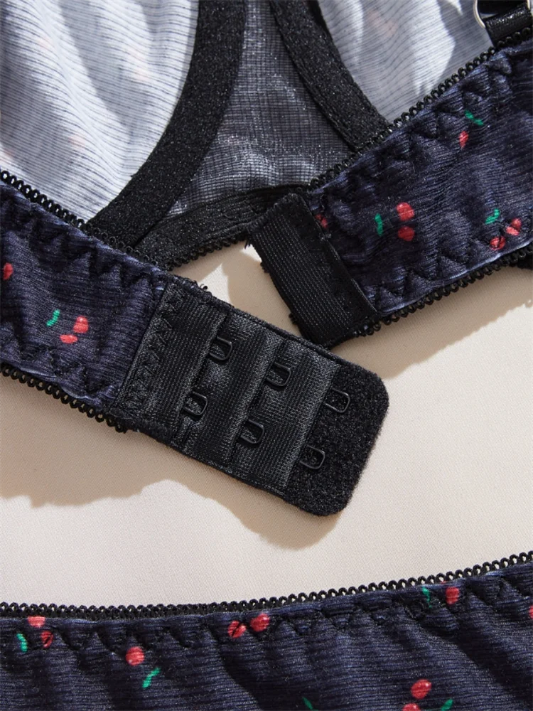 This delicate 3-point set features a lightweight sheer bra, matching panties, and adorable bow accents, all adorned with a sweet cherry print.