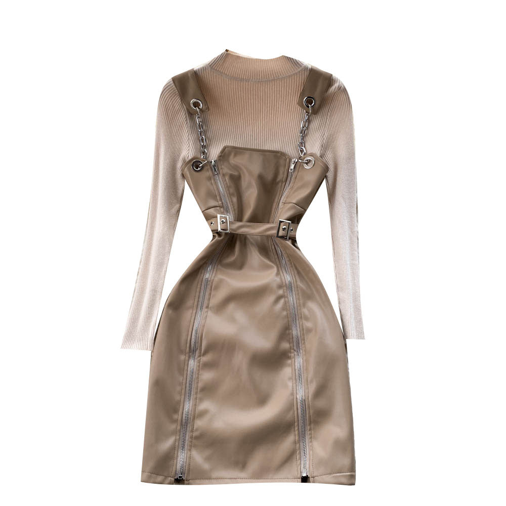 The double zipper faux leather skirt delivers a flattering, structured silhouette, while the soft knitted sweater adds warmth and texture for all-day comfort.