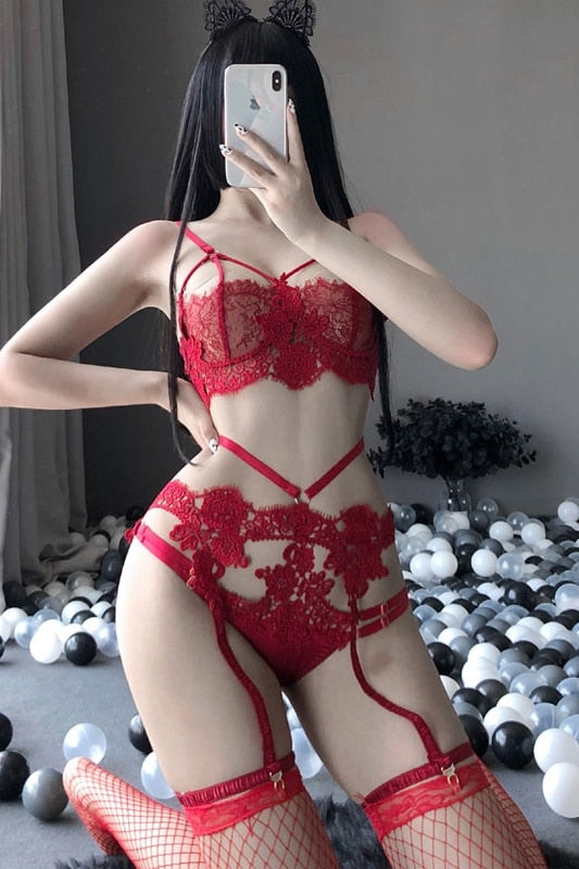 Made of high-quality material, acrylic. Beautiful embroidered V-neck, see-through, supportive underwire, sexy lace design. Adjustable shoulder straps, breathable and comfortable fabric. Hook and eye closure. Perfect for hot nights, everyday lounges, cosplay lingerie, honeymoon, and so on.