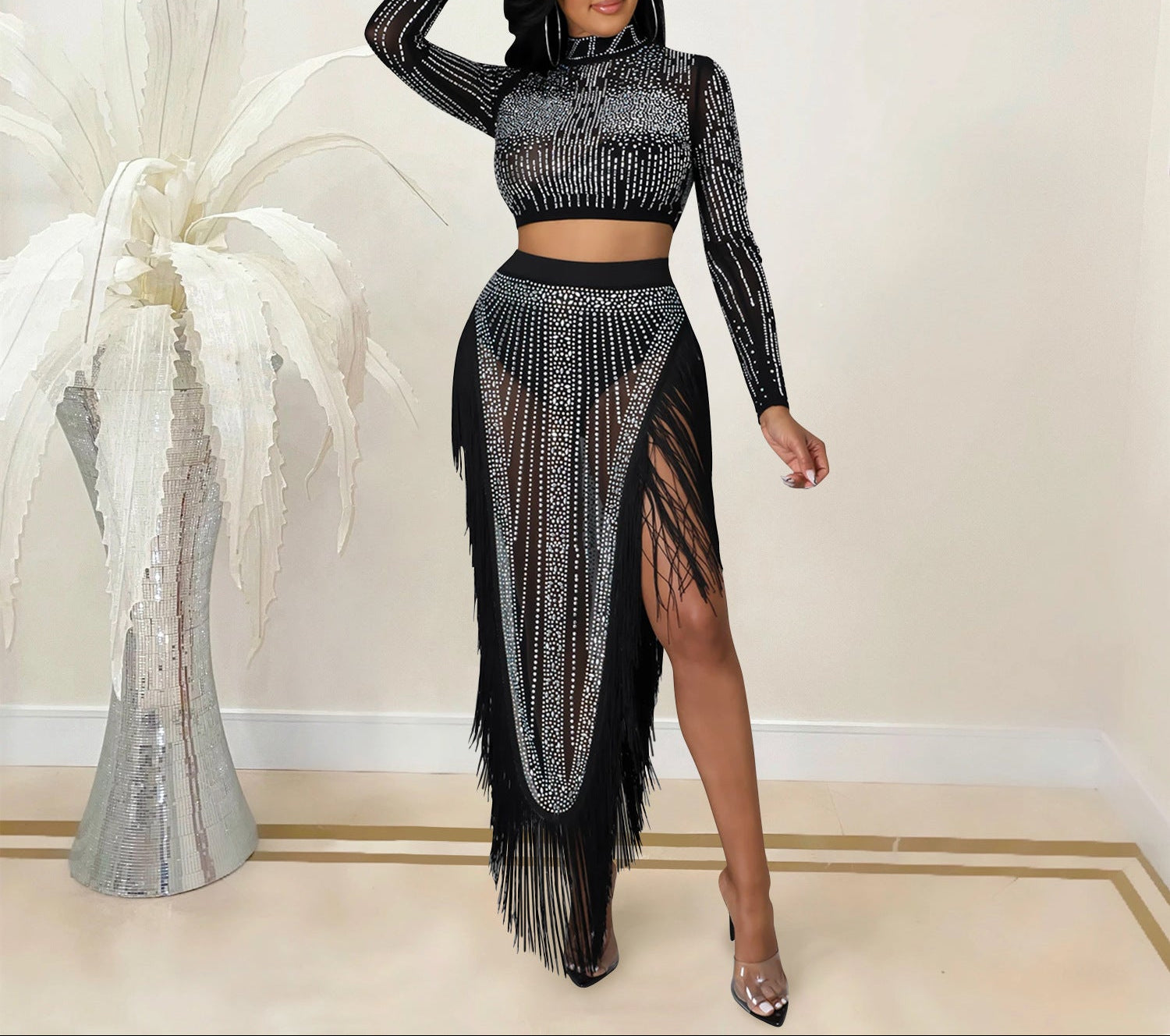 This dazzling dress features a sleek mesh overlay adorned with shimmering iron drill embellishments that beautifully catch the light with every move.