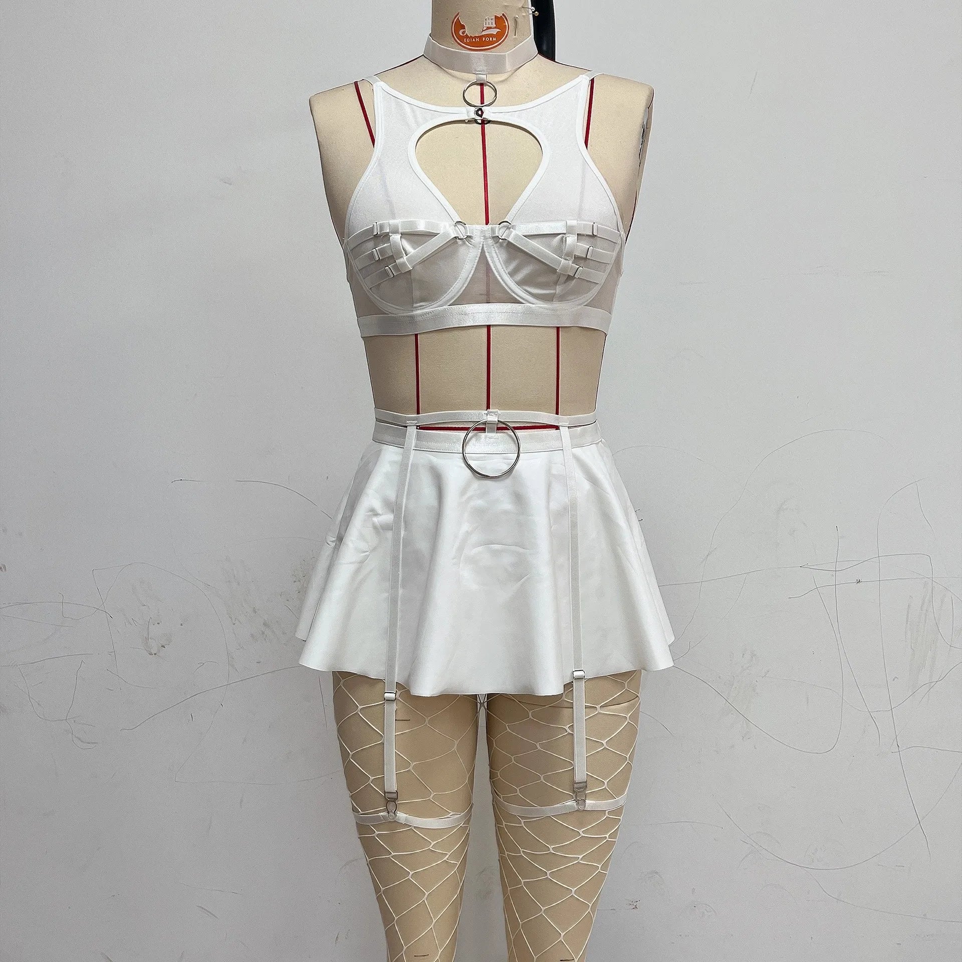 The leather-like apron adds an edgy touch to this romantic and alluring lingerie.