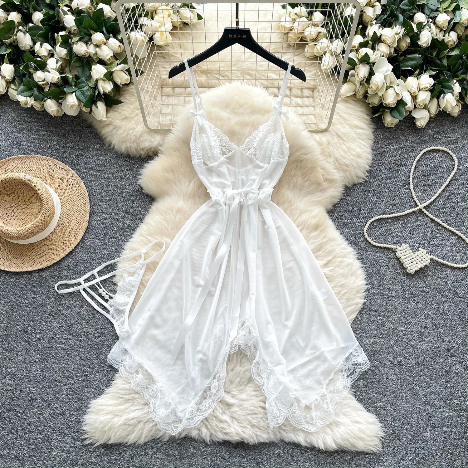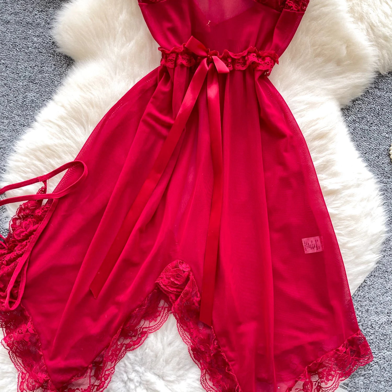 This sheer mini nightgown features a unique irregular hemline, delicate lace splicing, and a slim, flattering silhouette that exudes confidence with every movement.