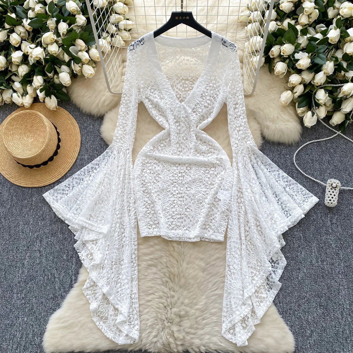 Turn heads in this stunning lace hollow-out dress with a deep V-neck, elegant flare sleeves, and a sheer body-hugging fit. Whether you're hitting the club, a date night, or attending a glamorous event, this dress will ensure that all eyes are on you!