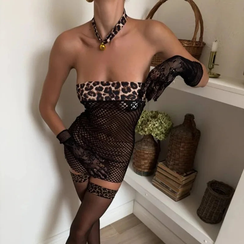 xUnleash your bold side with this striking leopard print mesh lingerie set featuring intricate hollow-out lace detailing and patchwork construction for contemporary style. This fierce yet feminine collection showcases exotic animal print combined with see-through mesh panels that create captivating visual dimension throughout the design.