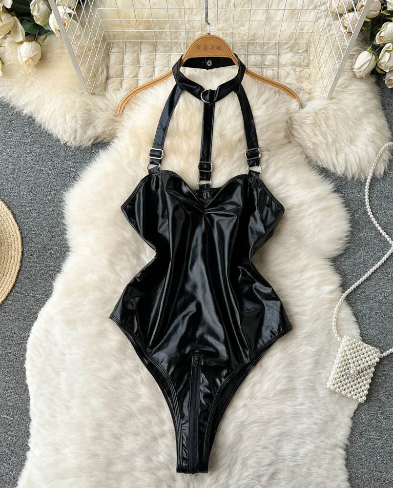 Command the spotlight with our Luxury PU Leather Halter Backless Bodysuit — a bold fusion of edgy fashion and sensual confidence.