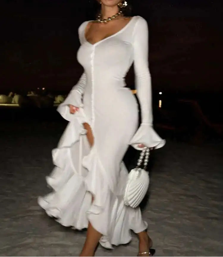 This flare sleeve maxi dress delivers a romantic, feminine look ideal for polished autumn styling.