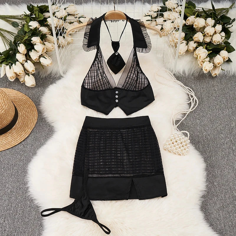 xEmbrace timeless preppy sophistication with this versatile three-piece outfit set featuring turn-down collar top, A-line mini skirt, and coordinating accessories for complete styling.