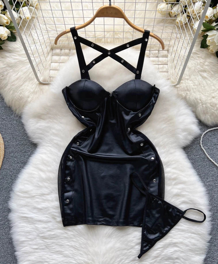 This erotic leather night dress features a hollow-out design and backless detail that exudes confidence and sensuality.