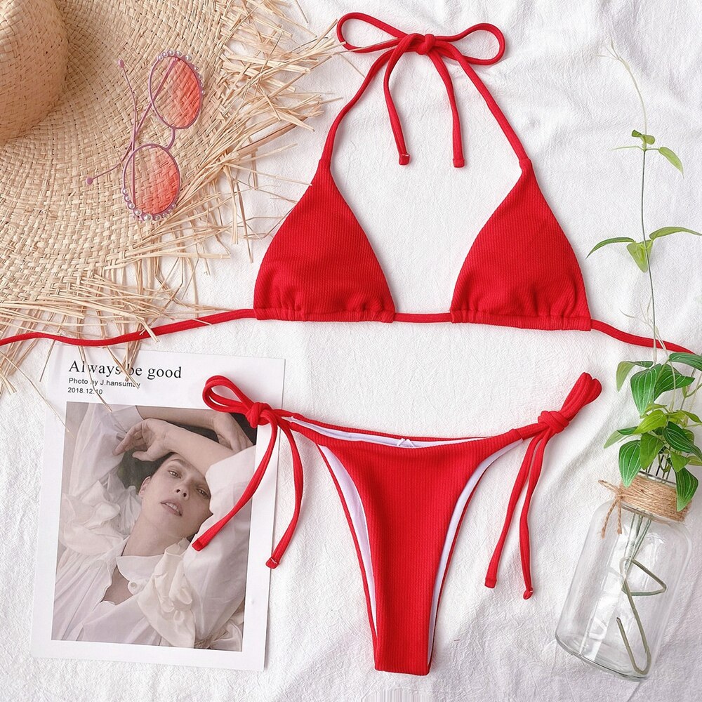 Made up of high-quality material, polyester, and spandex, high elasticity, soft and comfortable. Wire-free, spaghetti straps triangle halter bikini set. Low waist high-cut cheeky bottom matching. Great for swimming, pool, beachwear, sporty, honeymoon, party, etc. Hand wash and machine wash.