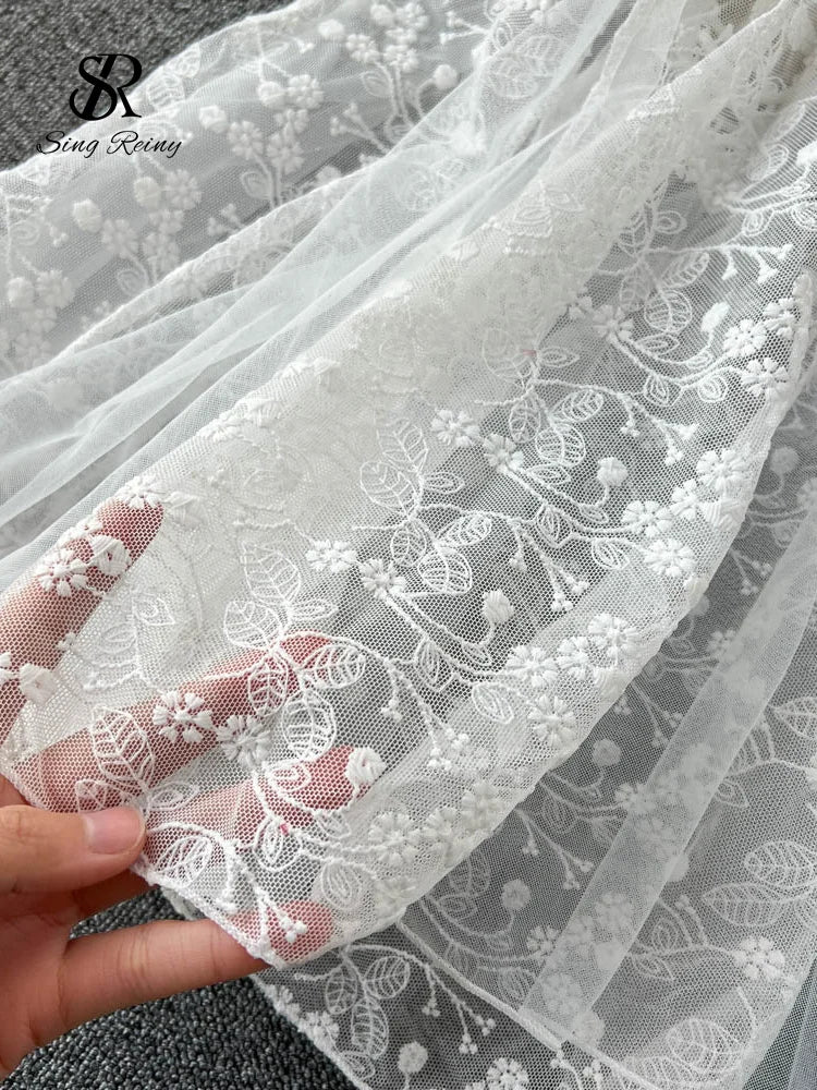 Features: Embroidery, ruffles, sheer finish