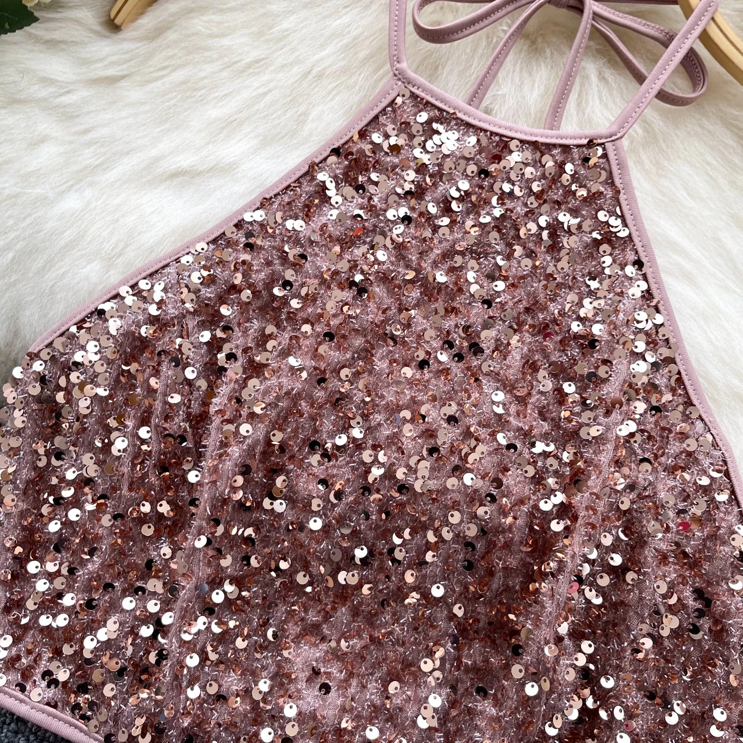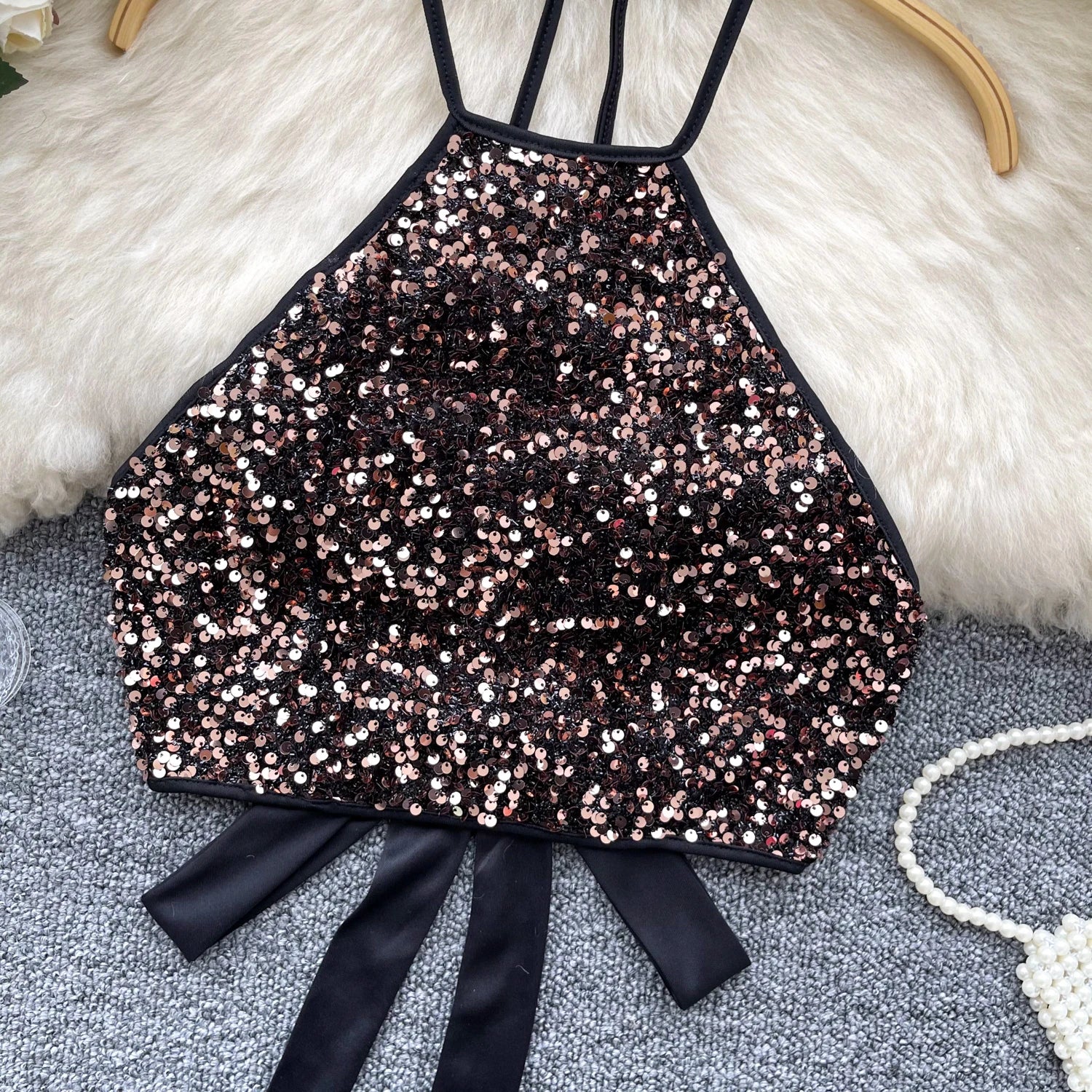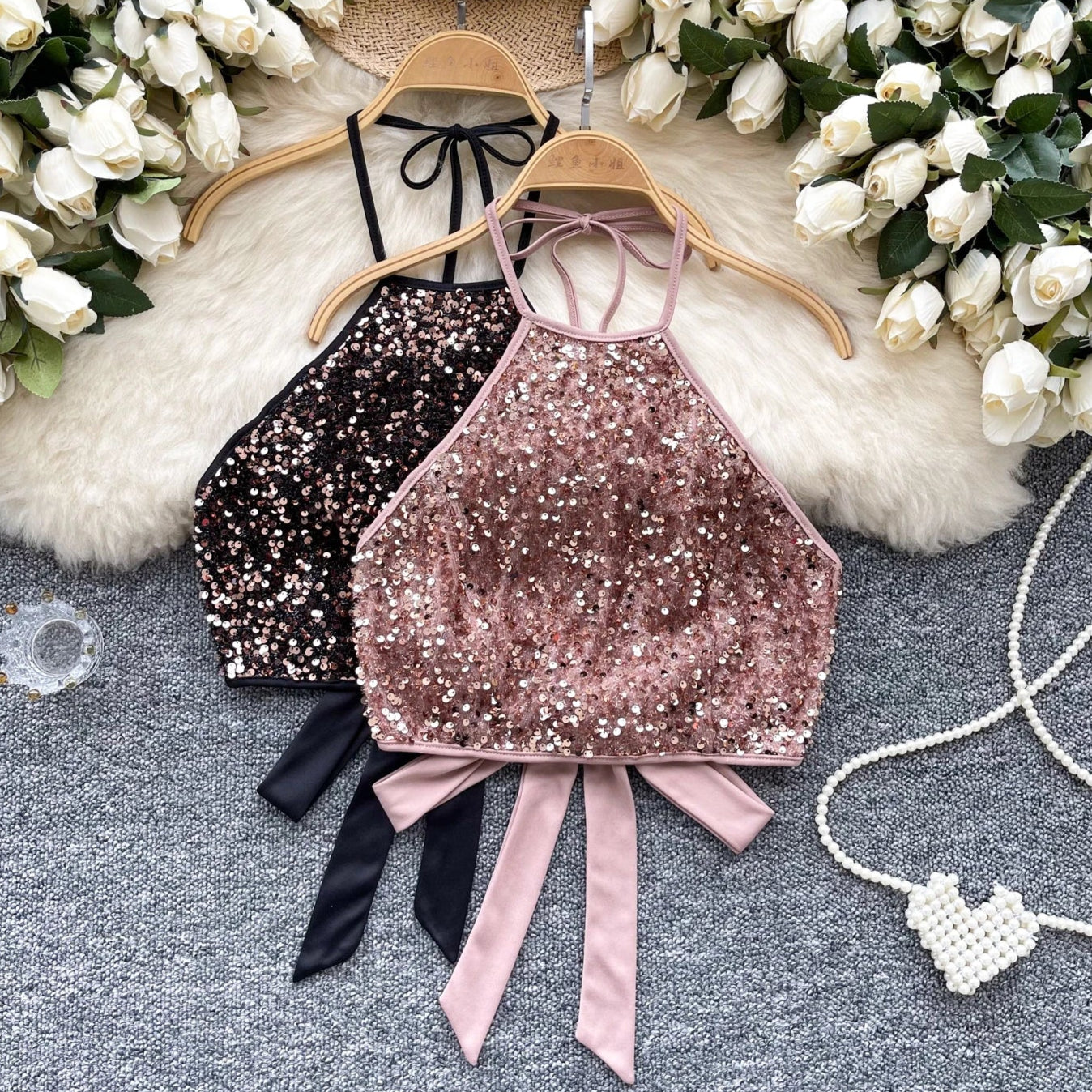 This shiny sequined top features a halter neck design and backless detail that adds a touch of sophistication and allure.