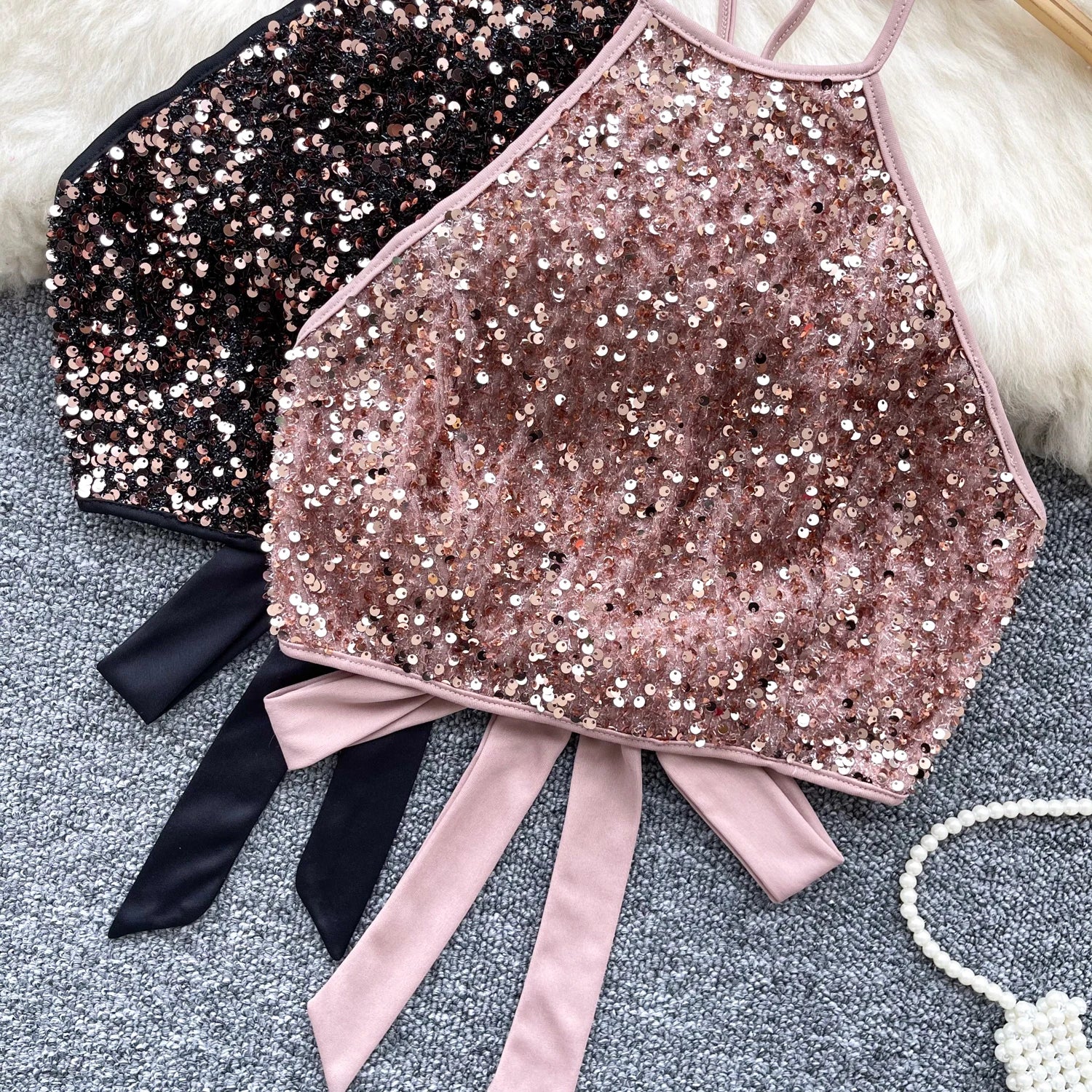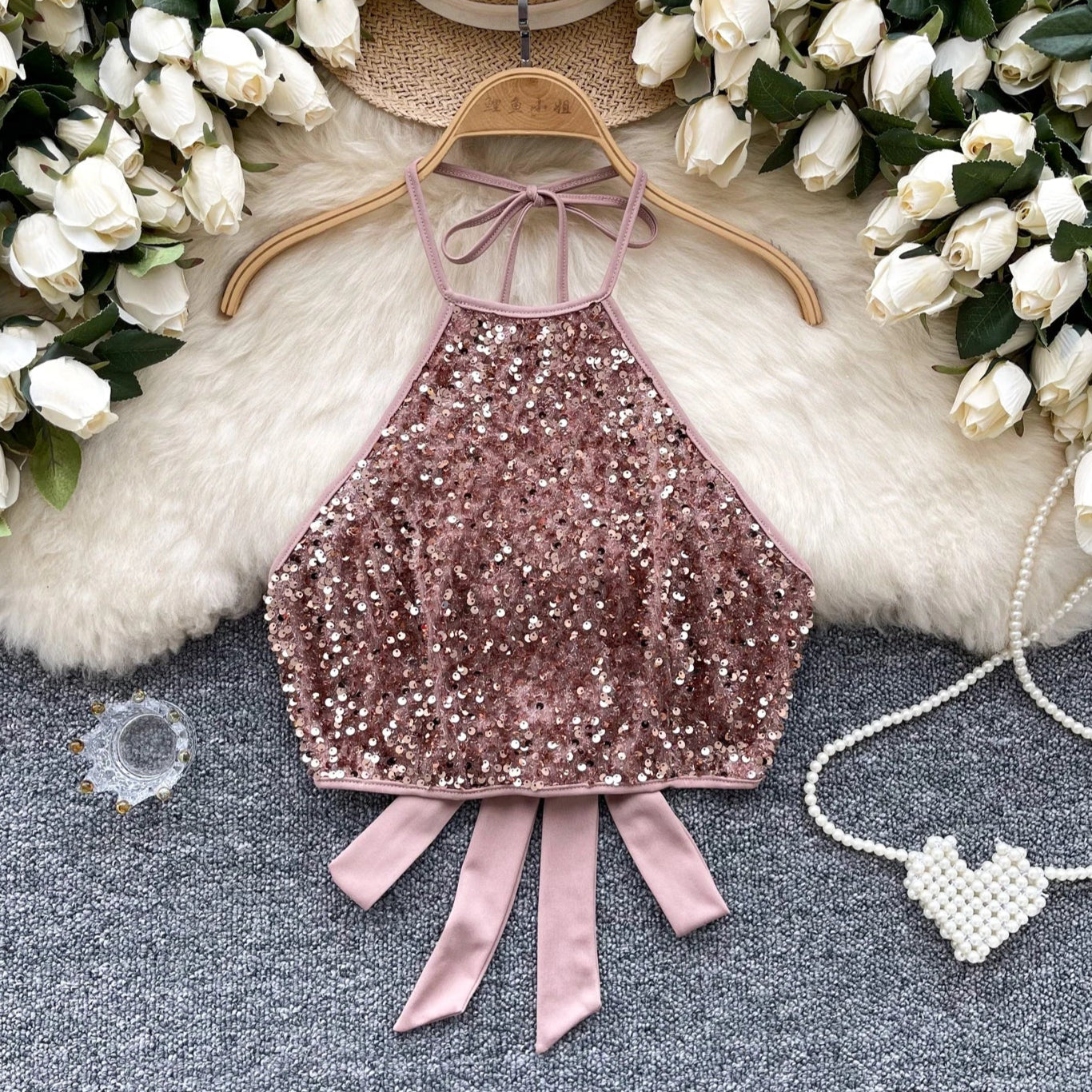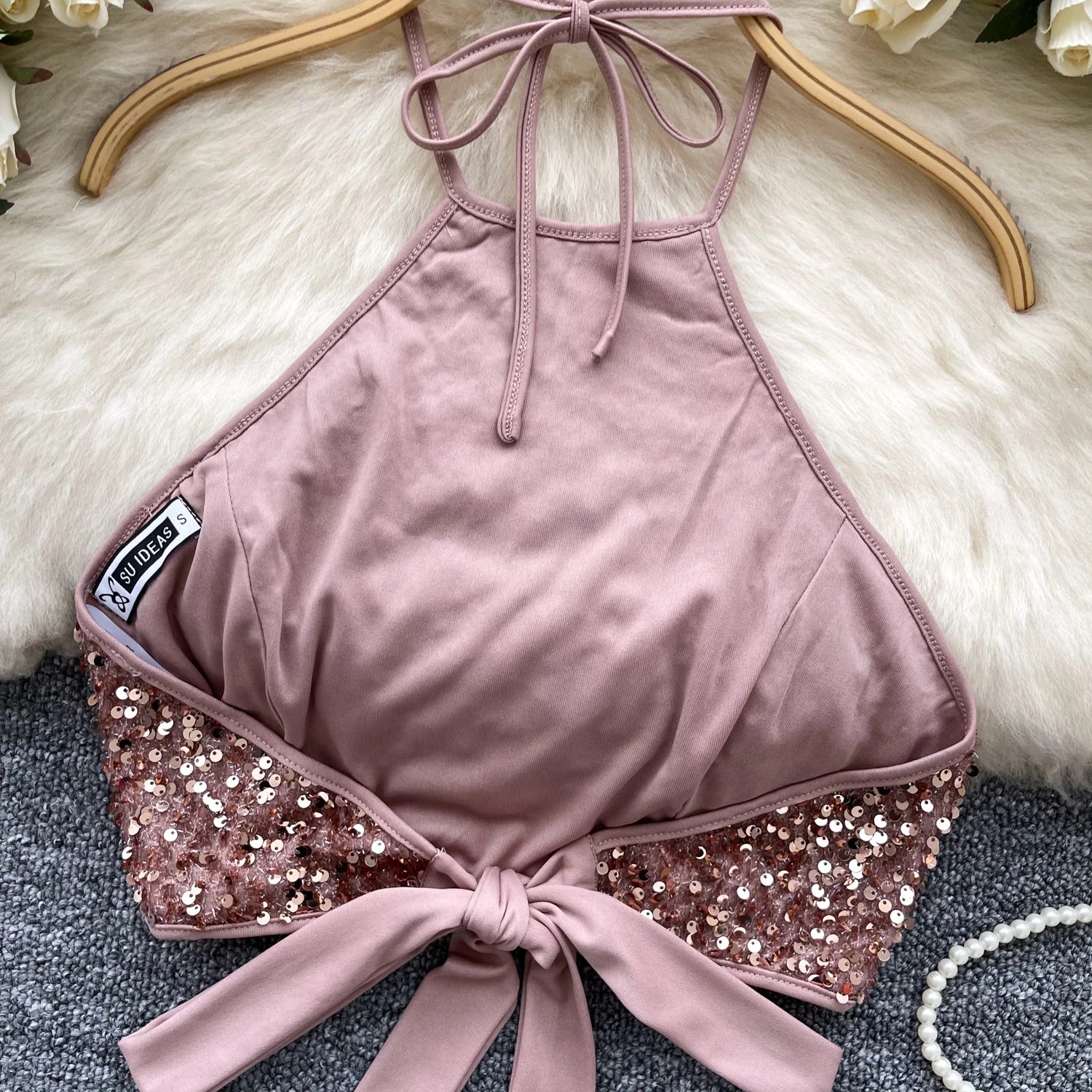 This shiny sequined top features a halter neck design and backless detail that adds a touch of sophistication and allure.