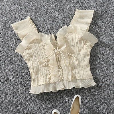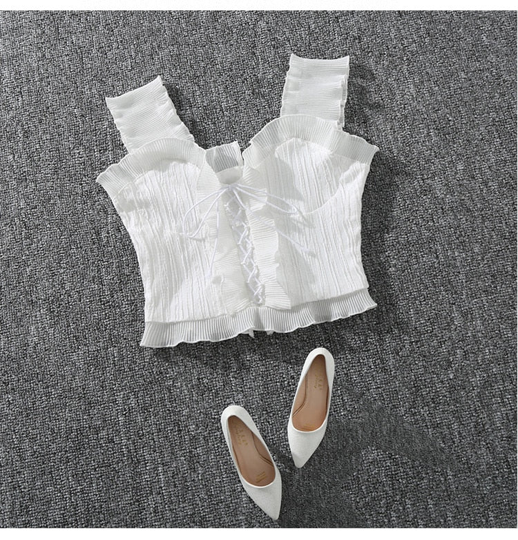 xWomen's Bustier Crop Tops made of high-quality Polyester, the fabric has some stretch Ruffle trim detail, self bow tie front, sexy and cute look Boho style, sweet crop cami tank, great to pair skirts, shorts, outwears. Suitable for beach, night out, vacation, home, club, casual, dating, school, and daily wear.