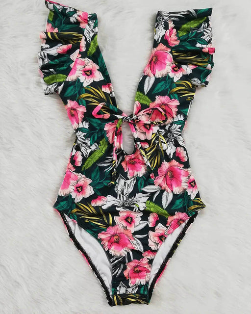 Tropical ruffle V-neck one-piece swimsuit is for your vacation, summer beach, swimming pool, bathing, resorts, bikini party. Women Ruffle Monokini swimsuits are the best gift for yourself and your girlfriends.