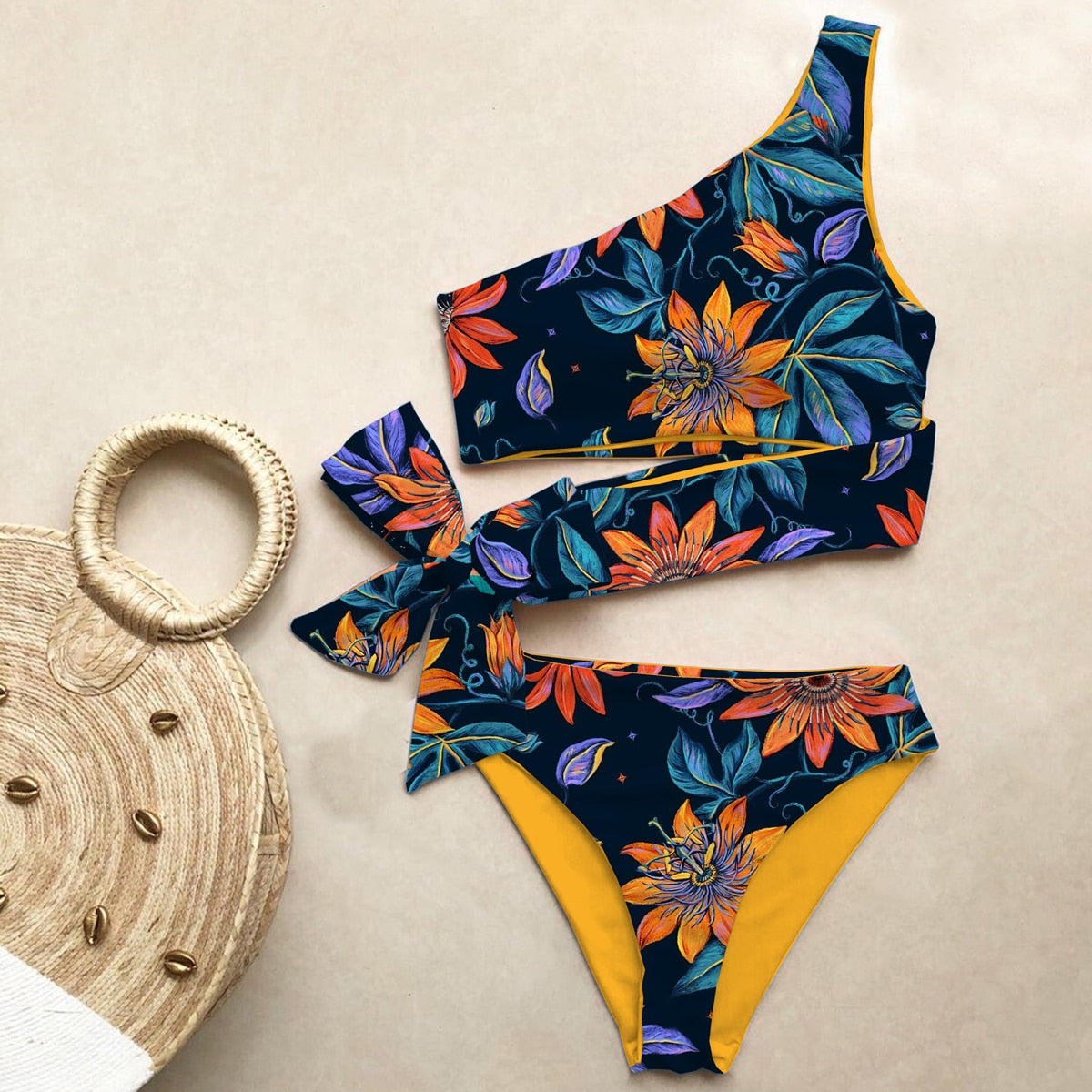 Made of polyester and spandex, lightweight, soft, quick-dry, highly stretchy. Sexy bikini one-shoulder crop top with a thin strap but stay firmly. Removable pads for breast holder. Cheeky bikini bottom is ideal for any woman seeking fuller coverage and showing off her legs. The low-waisted swimsuit is refreshing. This women bikini is perfect for summer swimming wear, beach parties, hot spring, vacation, surfing, pool party, clubwear.